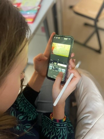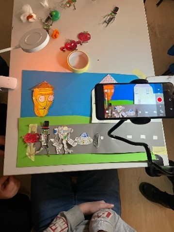 Der zweite Projekttag stand ganz im Zeichen der Herstellung von Figuren und Filmsets aus Tonkarton, Knete und Buntstiftzeichnungen. Die eigentliche Legetrick-Animation erfolgte an Tag 3. Ausgestattet mit Handystativen und Leuchtmitteln wurden nun Figuren und Landschaften mit unzähligen Aufnahmen im Stop-Motion-Verfahren animiert. Im Anschluss daran erfolgten Tonaufnahmen und die Bearbeitung mit der entsprechenden App.