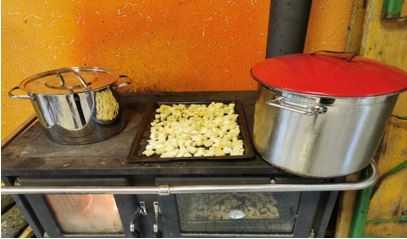Die Kochgruppe heizte als erstes die Kochstelle und fing an, das Gemüse für die orientalische Suppe zu putzen.