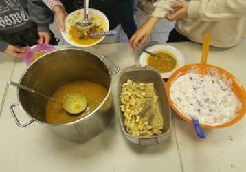 Auf dem Tisch befanden sich der Topf mit der leckeren heißen Suppe und das Dessert, welches aus Joghurt und frischen, gesunden Früchten bestand.